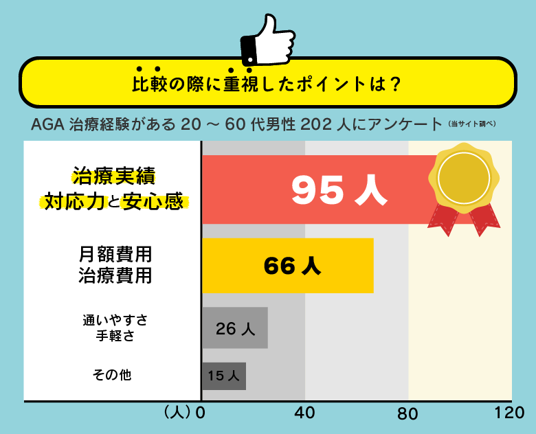 最初は育毛シャンプーや育毛剤と考える人は多いけど、経験者アンケートによると、AGA治療以外の対策をした人の約70%が効果を実感せず、最初からAGA治療しておけば良かったと答えています。